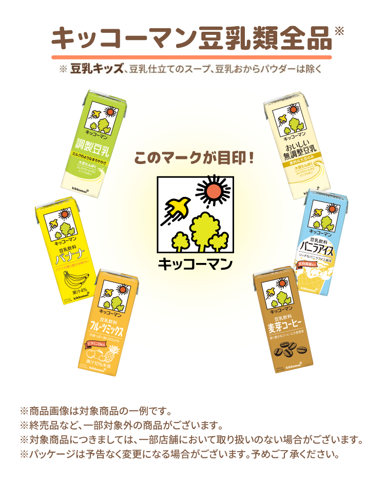キッコーマン豆乳類全品が対象商品です。パッケージに告知のない商品でも応募は可能です。