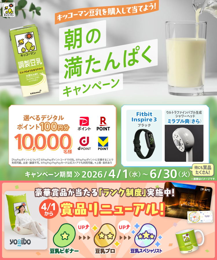 ■その他、本キャンペーンに関する注意事項は、「キッコーマン豆乳 まめレージ利用規約」及び「キッコーマン豆乳 まめレージ応募要項」をご確認ください。