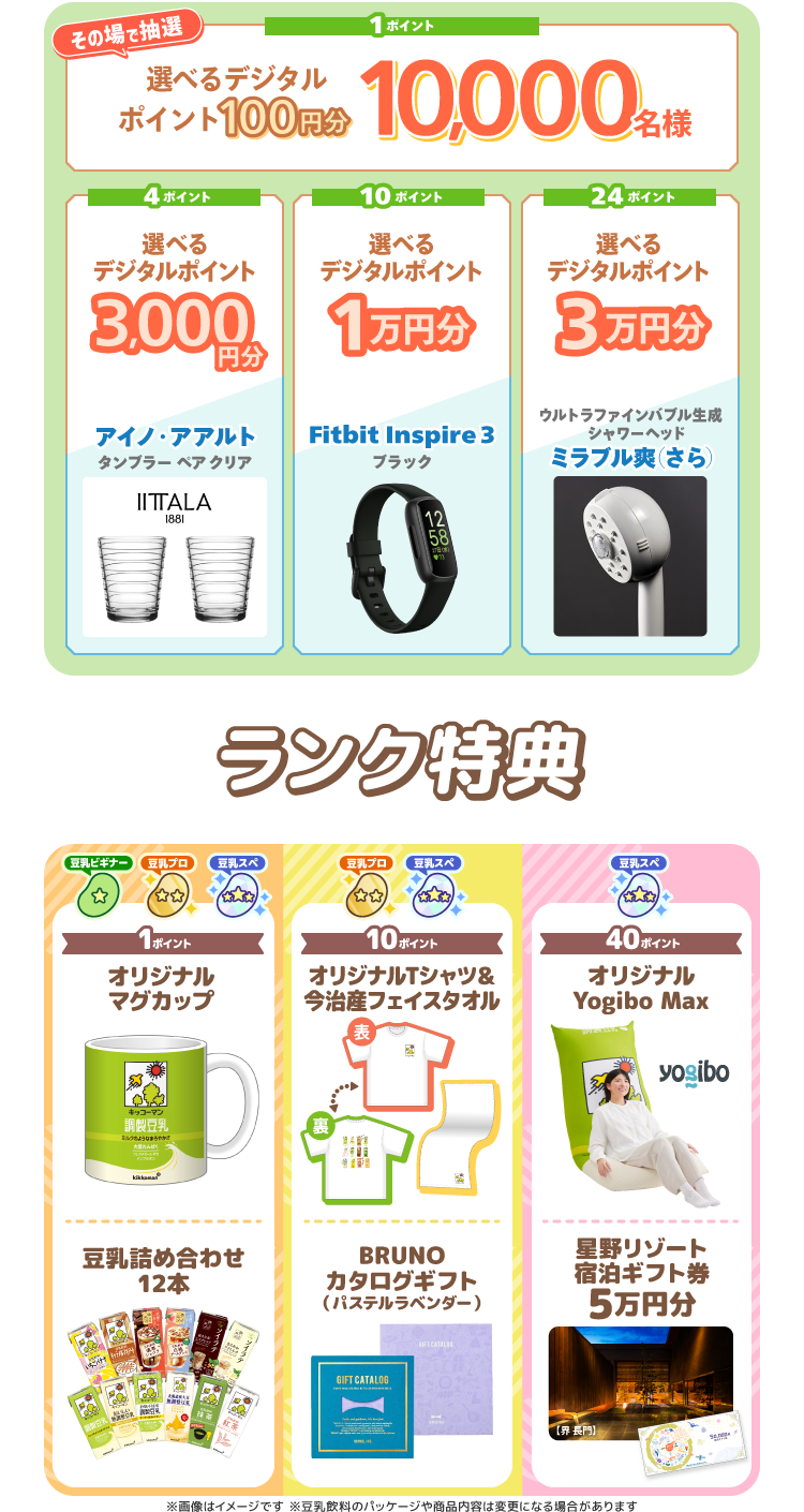キッコーマン豆乳を購入したレシートをアップロードすると、ポイントが貯まりお好きな賞品が抽選で当たるサービスです。